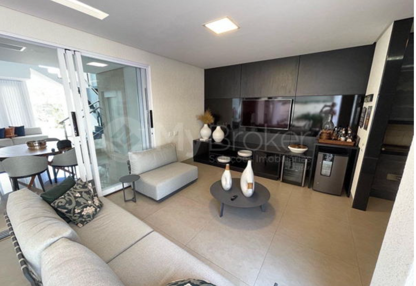 Varanda gourmet com sala de tv e mesa de jantar.